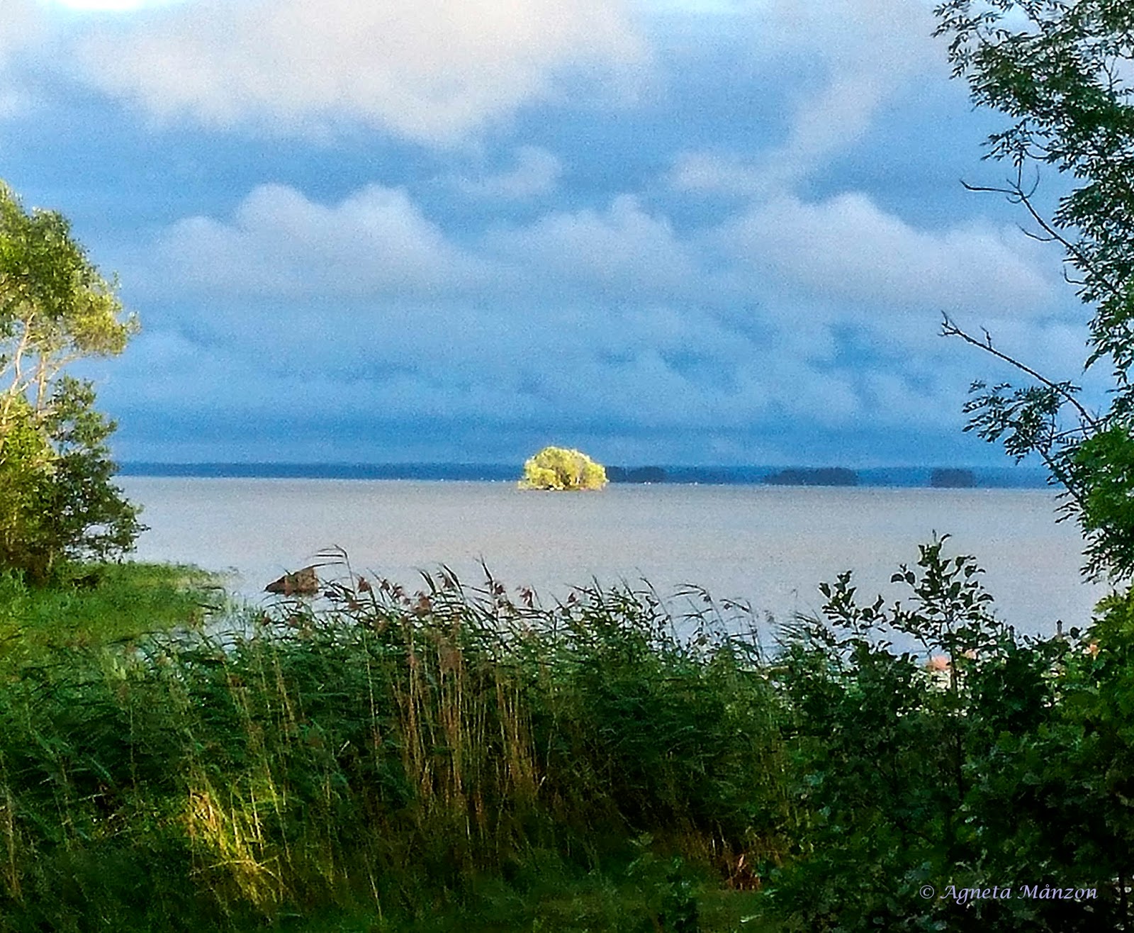 Det var på gränsen att den här bilden fick komma med. Den är tagen med mobilen med långt avstånd så den blev kornig. Men det var så vackert med solen som lyste rakt på den lilla ön och med alla moln som bakgrund. Bara någon minut senare hade solen försvunnit bakom molnen igen.